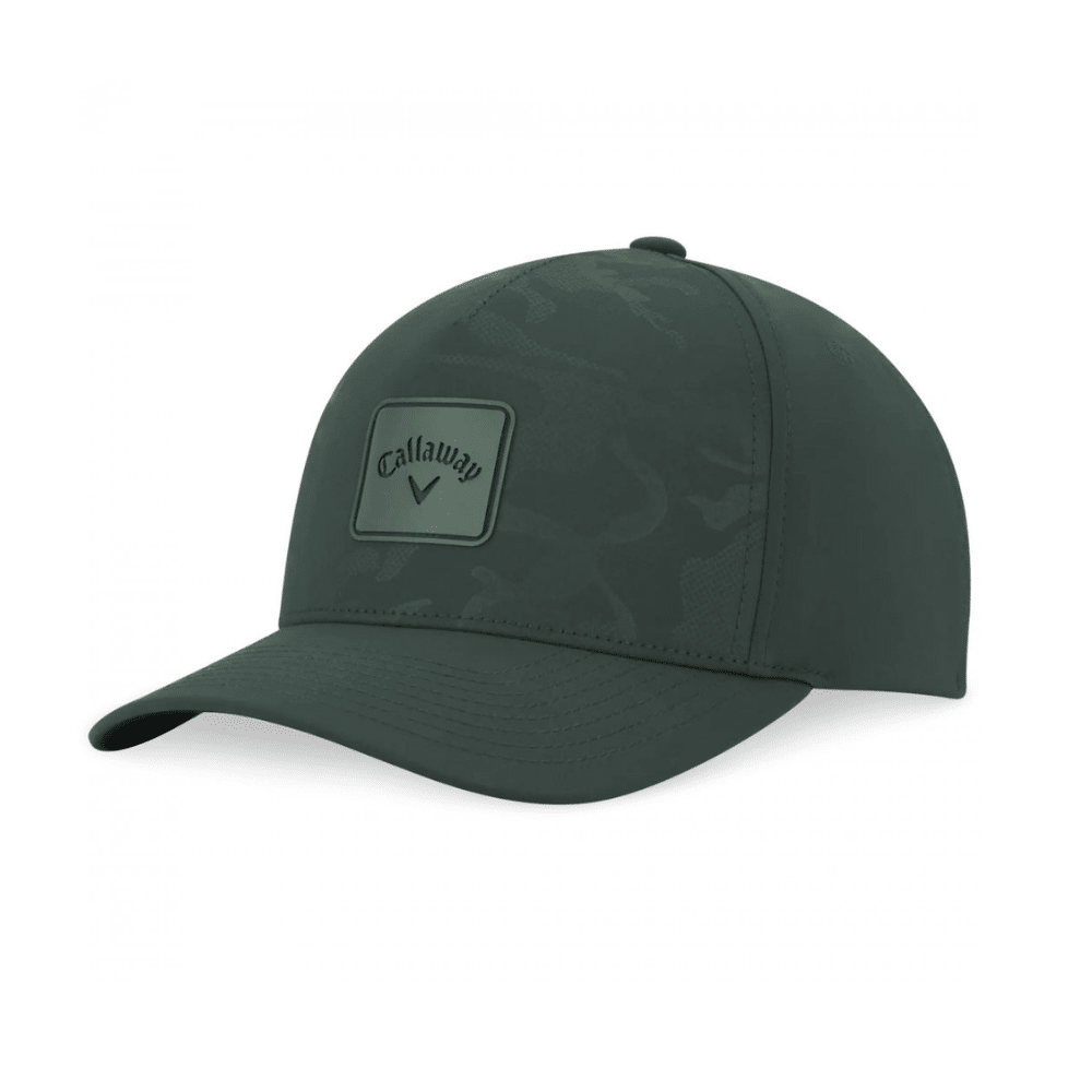 The “Callaway Favorite Track Cap Forest” is a camouflage-patterned hat in a “Forest” color that features a structured design, a raised Callaway patch, and an adjustable snapback closure. It’s a golf cap designed for a comfortable and secure fit.