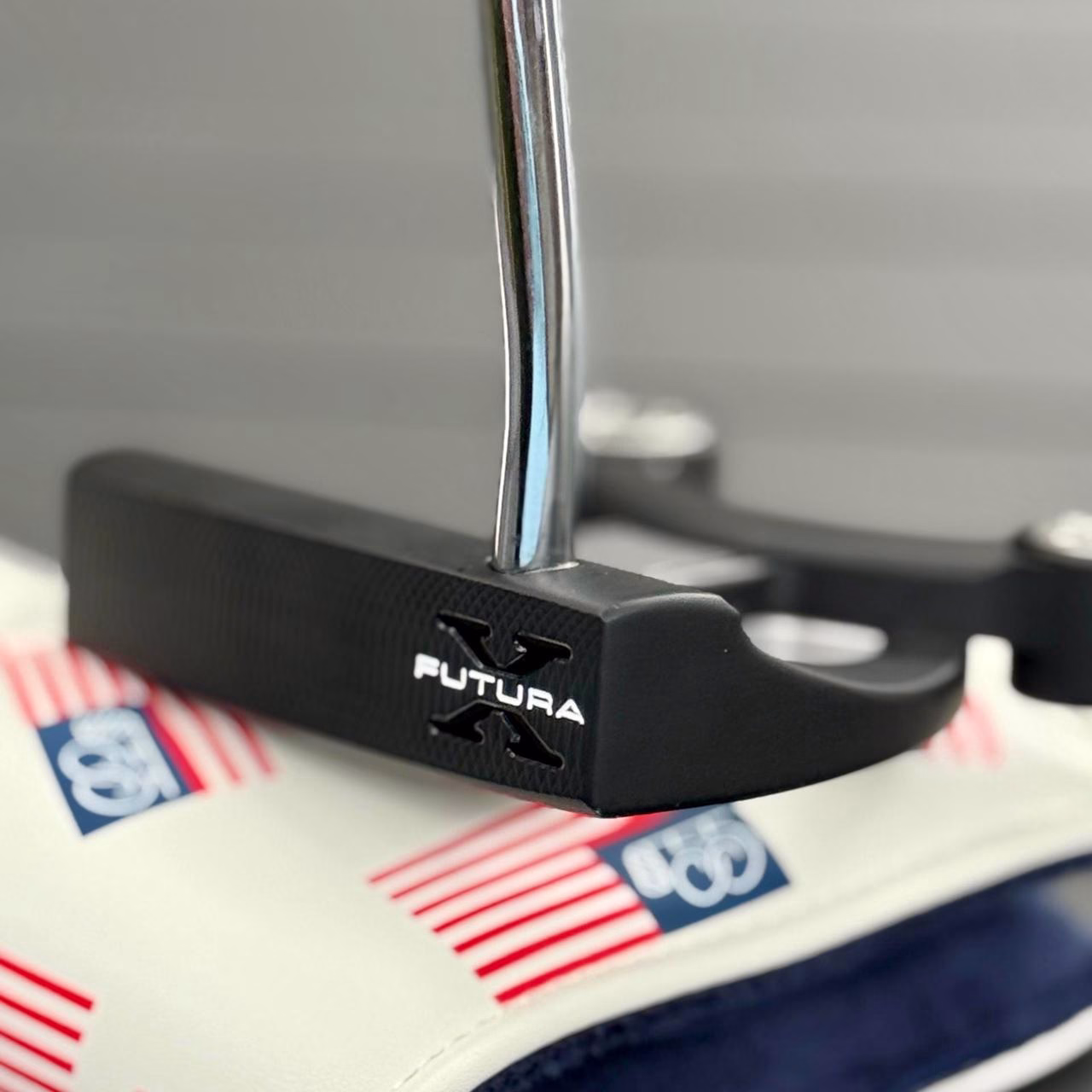 This one-of-a-kind Scotty Cameron Futura X features a custom Black Halo theme, blending a stealth matte-black finish with precision-milled stainless accents for a bold, futuristic look. Designed for maximum stability and forgiveness, the Futura X’s perimeter-weighted mallet shape delivers exceptional balance and confidence at address.