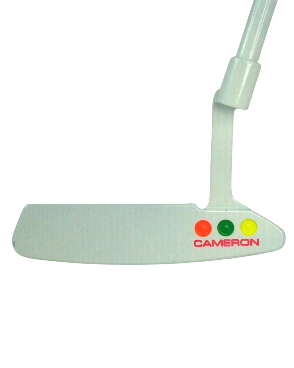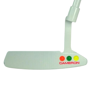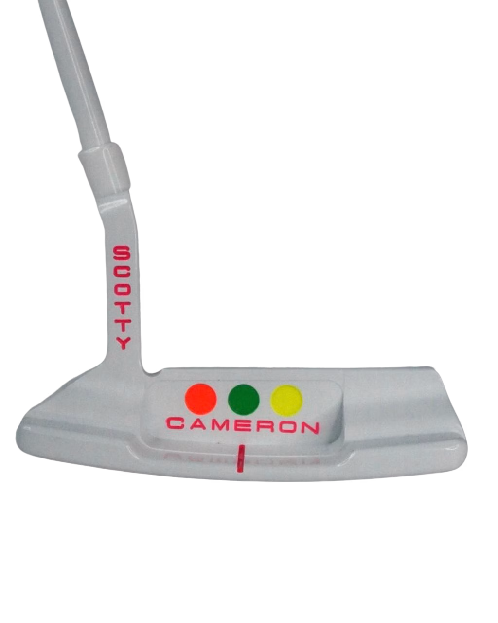 The three bold cavity dots in red, green, and yellow, paired with the clean white/silver base and colour-matched engravings, give this putter a vibrant, modern energy while retaining classic Scotty Cameron DNA.